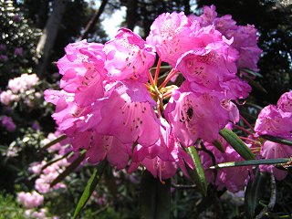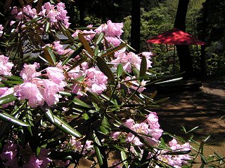 塩尻市上西条にある常光寺(地図)で、裏山に咲く2000本のシャクナゲ(石楠花)が見ごろを迎えています。 (写真=9日撮影)