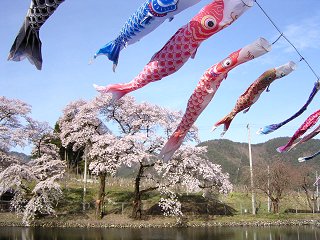 塩尻市中西条の三嶽神社前にある池では、満開のサクラの上をこいのぼりが春風を受けて泳いでいます。 (写真=18日撮影)