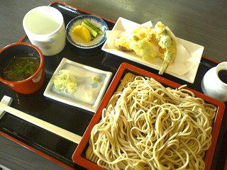 メニューは、「せいろそば(二八)」のほか、野菜のてんぷら(たらの芽、ししとう、かぼちゃ、さつまいも)、そばの実雑炊、そば寄せがセットになって、料金は単品と同じ700円。フェア開催中に食事をされた方には、次回以降利用できる100円引きの食事券がプレゼントされます。 (写真:5周年セットメニュー=4日撮影)