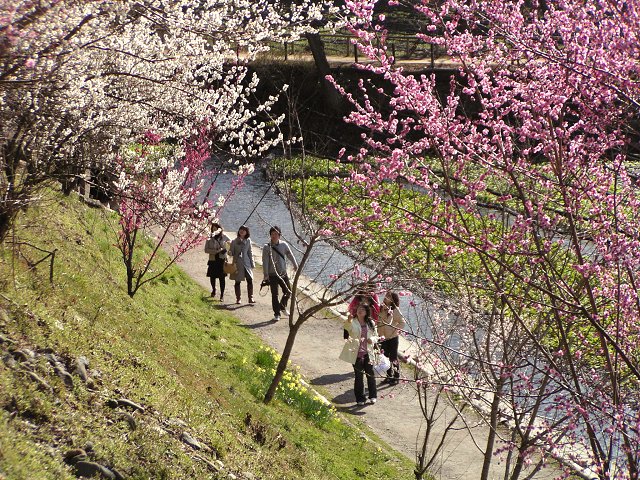 写真は、安曇野市御宝田の大王わさび農場に咲く紅梅と白梅の競演。わさび田には、わさびの白い花も咲き始めました。 (写真=28日撮影、640×480拡大可能)