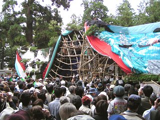 県の無形民俗文化財に指定されている御船まつりのクライマックスは午後3時頃から始まります。 (写真:穂高神社=26日撮影)