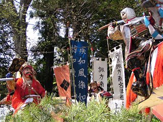 安曇野市穂高の穂高神社(地図)で2日、二十年に一度の盛儀・大遷宮祭と穂高人形まつりが始まりました。神社境内には、7つの場面を描いた穂高人形の飾り物が設けられ、訪れた観光客は安曇野に残る伝統文化をカメラに収めていました。祭りは17日まで行われ、9日午前3時には新しい本殿に御神体を移す「遷座式」の儀式が行われます。 (写真=2日撮影)