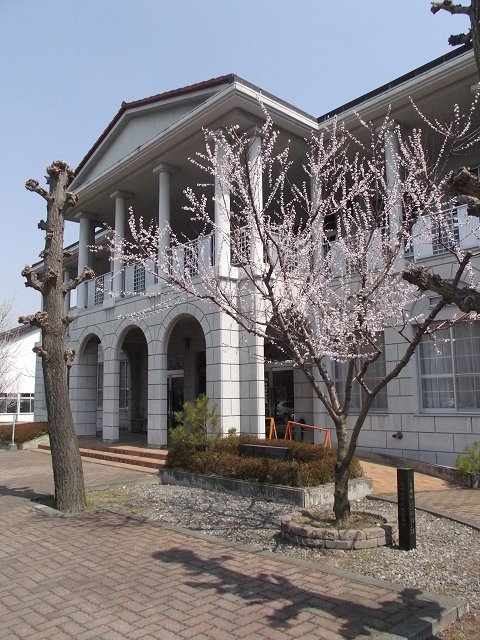 安曇野市豊科の南安曇教育文化会館前に咲く魯桃桜が見ごろを迎えています。