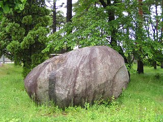 豊科近代美術館入口にある大きな石。さて、この正体は…? (写真=31日撮影)