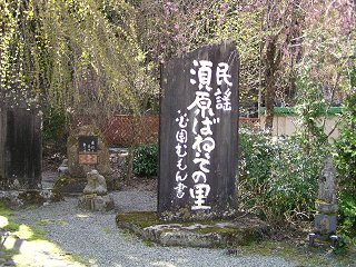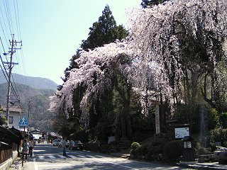 木曽郡大桑村須原(地図)にある臨済宗妙心寺派の寺院。山門、本堂、庫裏とともに国の重要文化財に指定。写真は門前のシダレザクラ。 (写真=4月11日撮影)