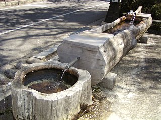 案内図によれば、現在須原宿には湧き出る水舟が7つ(実際には9つあるとの情報も)あり、ほかにも独特なカタチをした井戸舟が街道沿いに残されています。人気のある水舟は、脇本陣だった西尾酒造店向かいの本町水舟と茶屋町水舟とか。 (写真:定勝寺前にある門前上水舟=平成21年4月11日撮影)