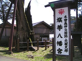 義仲公は、このあたりの平地に城をかまえ八幡宮を祭ったと伝えられている。十三歳にして元服。木曽次郎義仲と改め、治承四年(一一八〇)一千余騎を従え、ここに平家打倒の旗挙をした。時に義仲二七歳であった。以後旗挙八幡宮と呼ばれている。