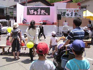 | 特設ステージには風船遊劇団ゴンベエワールドさんが登場!(左) 大好評!地酒七笑さんの「カリカリ梅」(右) |