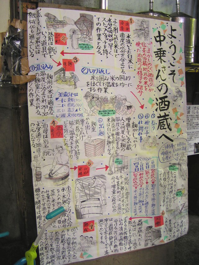 今回初めて中善酒造店さんの蔵祭りを訪ねました。入口で頂いたクイズと兼用になっているアンケート用紙を片手に、蔵見学にチャレンジ。手造り感たっぷりの案内板を読みながら答えを探すなかで、普段はあまり考えたことのなかった酒造り流れや、「中乗さん」ブランドのお酒の特徴、開田高原の雪の中で貯蔵しておいたという自慢の雪中貯蔵酒のことなど知ることができました。仕込みに使う御岳山系の伏流水、あれはおいしかったなぁ。