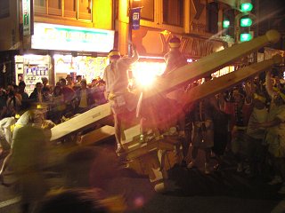 23日夜、木曽郡木曽町福島(地図)の水無神社例大祭で、祭り装束に身を包んだ若衆たちが御輿を縦に横に転がす「みこしまくり」が行われ、大勢の観衆が熱気にあふれた祭りを楽しみました。 (写真:御輿を横に転がす「よこまくり」の様子=23日撮影)