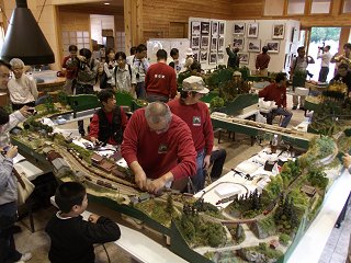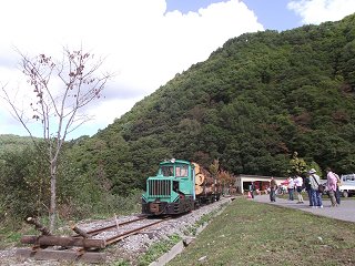 晴天に恵まれた10日は、会場の松原スポーツ公園(地図)周辺に敷設された保存軌道(せせらぎ線)上を、動態保存されているディーゼル機関車が牽引する貨車に乗り、森林鉄道を体験する乗車会を実施。管理棟では精巧に作られた森林鉄道模型ジオラマの公開運転や写真展なども行われ、訪れた人たちは、かつて王滝の山間を走り、人々の生活を支えた森林鉄道の姿に思いを馳せていました。