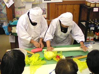 正午からの講習会では、「ひまわり」の絵柄を披露。黄色の花びらとなる部分を幾つも作り、葉となる緑の部分を組み合わせ、おおよそ20センチくらいの太さになったところで左右に伸ばし完成。見学していた参加者のみなさんは、手際良い作業に感心しながらノートに書きとめていました。