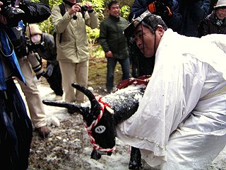 祭りは、400年ほど前から続く伝統行事。県無形文化財にも指定されている歴史のあるもので、一連の神事の後、普段は宝物殿に収められている「張り子」の牛を、神官に呼び出された白装束の氏子二人が「毎年、毎年、いやでござる…」といいながらこれを抱え、水田に見立てた本殿前を1周(計3周)する間、見物人が「張り子」の牛に向かって雪玉を投げつけるユニークな祭りとして知られています。