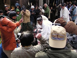 今年は例年なく雪が少なく参拝者が投げる雪は、今朝、聖山から運んできたもの…とか。