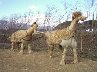 東筑摩郡筑北村の国道403号線沿い(地図)に大きなわら馬が2頭が登場し、ドライバーの注目を集めています。 (写真=28日撮影)