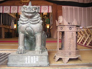 写真は「狛犬」と「吊燈籠」(村宝)。案内によれば、「狛犬」(写真左)は青銅製で、全長55センチ、幅45センチの大きさ。寛政3年(1791)更級郡力石村の塚田山崎が麻績惣氏子と共に寄進の銘があるそうです。