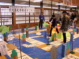 また午後は、茅野市在住のシンガーソングライター・美咲さんのミニコンサートや、イベント開催前から評判を呼んでいた「巨大善光寺街道すごろく」のゲームも行なわれ、サイコロの目に翻弄される参加者の姿を楽しむ人たちの笑いが会場を包んでいました。 (写真:巨大善光寺街道すごろく=7日撮影)