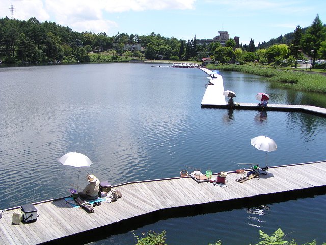 長野市で最高気温が33.8度を記録した18日、へら鮒釣りのメッカとして知られる東筑摩郡麻績村の聖湖(地図)では、のんびり釣り糸を垂れる人たちで賑わっていました。 (写真=18日撮影、640×480拡大可能)
