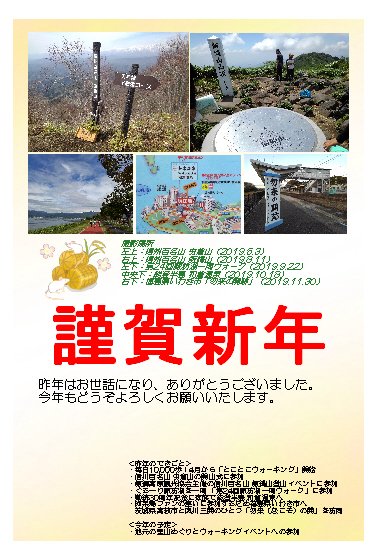 今回の年賀状は、なかなか機会がなく、これまで参加できなかった地元の里山(虫倉山・飯綱山)の記念登山イベント、ウォーキングイベント(第24回諏訪湖一周ウォーク)への参加、ひさしぶりに家族旅行を楽しんだ能登半島和倉温泉、そして福島県いわき市に向かう途中、以前から訪ねてみたかった「勿来(なこそ)の関」の5つのスポットを厳選して取り込んでみました。