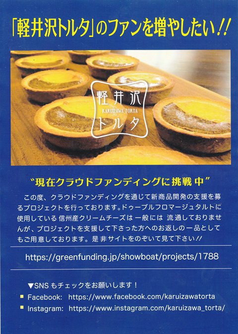 本日も、まだまだ知らない方へ発信中です!https://greenfunding.jp/showboat/projects/1791 クラウドファンディングと言う形で、私たち軽井沢トルタの目標を形にしていくために現在資金を調達させていただ...