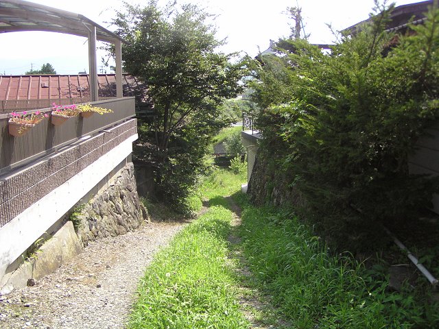 「信玄の棒道」は、武田信玄が信州へ兵を進めるために設けた軍用道路で、八ヶ岳南麓から西麓にかけ上・中・下の3本の道が通っていました。南大塩区が設けた案内板によれば、茅野市に残るこの棒道は「下の棒道」と呼ばれるものの一部と思われます。 (写真=17日撮影、640×480拡大可能)