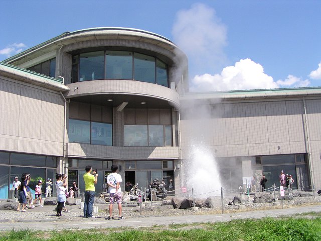 センターに掲げられている案内によれば、温泉掘削中の昭和58年(1978)に噴出した間欠泉は、高さ50メートルほどの高さまで自噴することで知られていましたが、次第に自噴間隔が長引くようになり、自噴が止まった後はコンプレッサーで圧縮空気を送り噴出させているそうです。