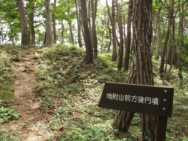 平地からの高さが約300mもある地附山の山頂に、全長36.1mの地附山前方後円墳が作られています。崖くずれや盗掘などによって形が変わっており、前方後円墳であった可能性も考えられます。また、山頂から少し下った平らな場所には、上池ノ平1~6号墳という円墳が作られていました。1985(昭和60)年に発生した地すべり災害によって1~5号墳は消滅してしまい、6号墳だけが今も残っています。