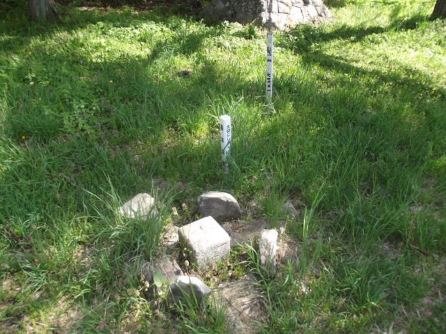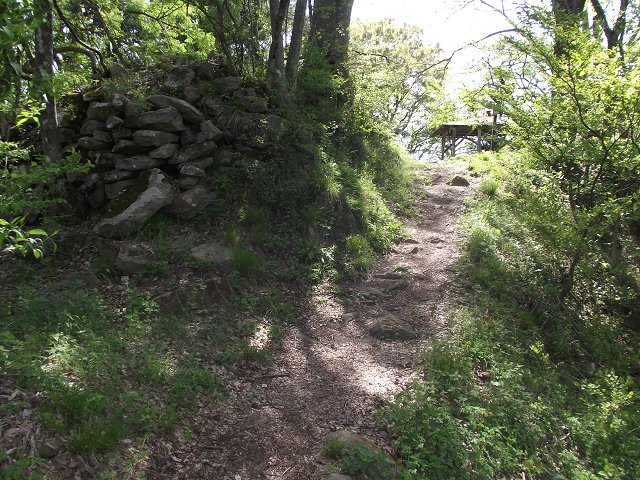 | 「馬かくし」と呼ばれる空掘 | 山頂近くに残る石垣 |