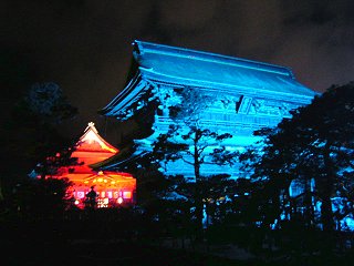 写真は、今年、解体修復工事が終了した三門(山門)と本堂のライトアップの様子です。