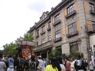 長野市の中央通りで4日、「善光寺表参道夏祭り」が行われ、担ぎ手に担がれた御輿が元気な掛け声とともに通りを練り歩きました。 (写真:「THE FUJIYA GOHONJIN」前を練り歩く御輿=4日撮影)