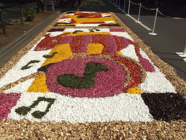 花キャンパスに使われた花びらは、新潟県から取り寄せた球根栽培用に摘み取られたもので、テーマは「ブレーメンの音楽隊」。また、タベストリーガーデンは上高井郡小布施町の農家が育てたペチュニアのポット12000個が使われました。
