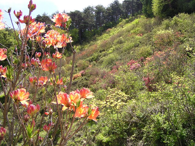 若穂保科の清水寺に向う途中の県道に、「赤野田つつじ山公園」と記された案内板が掲げられているのを見つけ、今回初めて訪ねてみました。案内があるくらいですから、地元ではよく知られたつつじの名所なのかもしれませんが、同じ長野市に住んでいて、ここにつつじの群落があるとは知りませんでした。