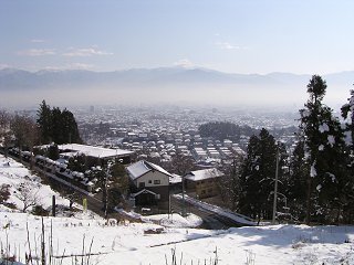 今日の長野市内の気温は、最低気温が氷点下6.2度。昨日と同じ気象条件なら、また見られるかな…と思い、上松の雲上殿まで出かけ、撮影したのが上の写真。。低い位置に広がる白い層が、もしかしたらその「逆転層」なのかもしれません。 (写真=23日撮影)