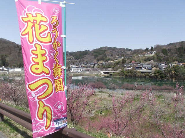 長野市信州新町の犀川河畔にひろがるろうかく梅園の様子。