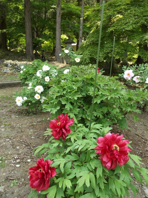 (写真:参道脇に咲くぼたん=20日撮影、480×640拡大可能)