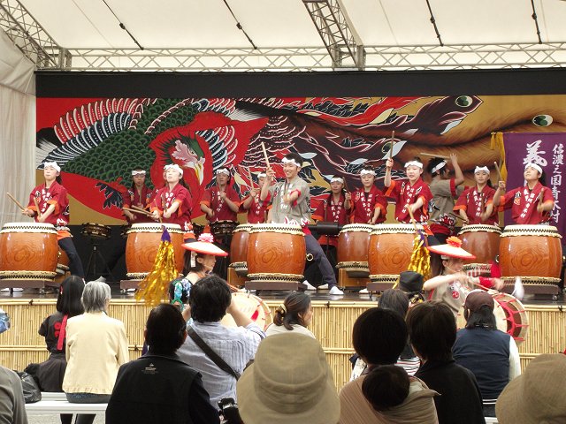 (写真:「日本一の門前町大縁日」から、左上:長野市の各地区の紹介、右上:東京海洋大学のさかなクンによる作品、左下:小県郡青木村の義民太鼓のみなさんによる演奏、右下:トイーゴ広場で開催された市内古里地区住民自治協議会のみなさんによる伝統芸能の披露=9日午前撮影、640×480拡大可能)