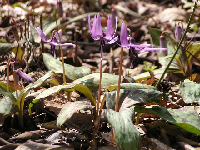 長野市西長野新諏訪町のカタクリ群生地(地図)では、愛らしいカタクリが開花し、訪れる人たちの目を楽しませています。 (写真=4日撮影、640×480拡大可能)