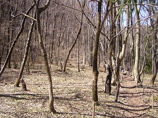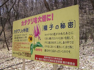 | 群生地(左)に咲くカタクリは、近くの加茂小学校の皆さんが育てました | |