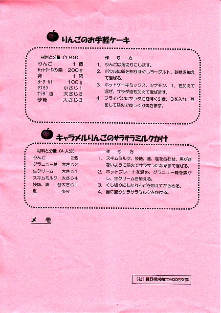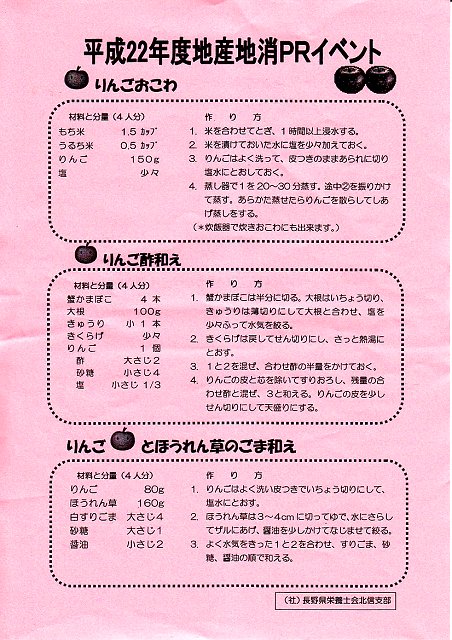 | 「りんごを使った料理レシピ」 (社団法人長野県栄養士会北信支部) |
