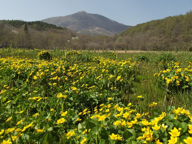 (写真:大谷地湿原に咲くリュウキンカと飯縄山=28日午後撮影、640×480拡大可能)