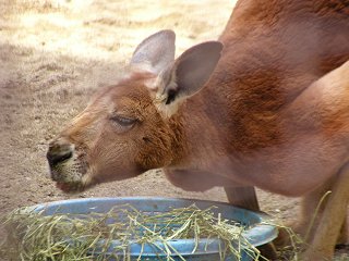 さて今日のハッチファミリーですが、訪ねたのがちょうどお昼ごはん時だったこともあり、全員が外にでてひなたぼっこをしていました。驚いたのは、クラッチがとても大きく成長していたこと。これだけ大きくなれば、別のカンガルー舎も必要かも…と思うほどの成長ぶりでした。砂場でひっくりかえっている様子は、まさにハッチそっくり。アカカンガルーって、みんなこういうポーズをとるものなのでしょうか…。