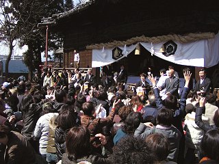 式は午前11時半頃から始まり、木遣り松代会のみなさんによる先導の後、本殿で新族と関係者が出席しての神事が行われ、式終了後、境内で式を見守る大勢の見学者の前で煌びやかな衣装が披露されました。 (写真:式終了後の福まき=15日撮影)