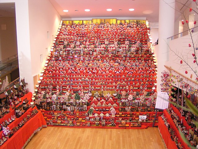 会場いっぱいのこの段飾り。高さが6メートル、横幅が7メートルほどあり、雛人形を並べるまでにほぼ1日かかるのだそうです。