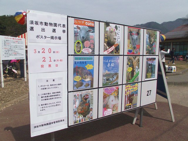 園内では、動物園ならではのユニークなイベントが盛りだくさん。なかでも入園者の関心を集めているのは、須坂市動物園の「顔」となる動物を選出する「須坂市動物園代表選出選挙」で、10候補者(動物)から1人(1匹・1羽・1頭…)に投票してもらおうというもの。投票は13日から既に始まっており、水面下では活動も活発化。