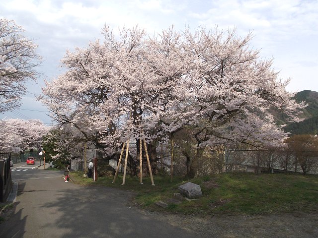 須坂市豊岡の豊岡小学校(地図)前にあるアズマヒガンザクラ。