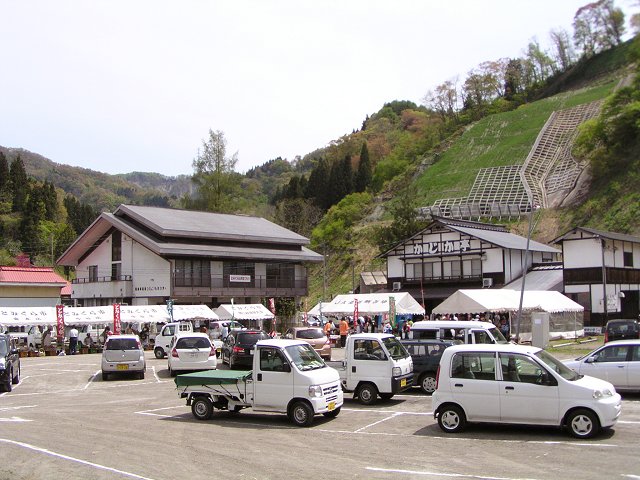 飯山市富倉の富倉活性化センター前(地図)で9日、恒例のとみくら山菜まつりが開催され、山うどなどの山菜のほか、富倉そばの販売、紙ヒコーキ大会などが行われ賑わいました。 (写真=9日撮影、640×480拡大可能)