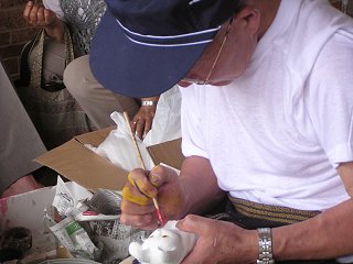 | 信毎の「なーのちゃん」も登場 | 奈良氏による土びなの絵付け実演 |
