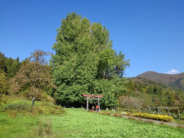 飯山市瑞穂にある県天然記念物の神戸の大イチョウ(地図)の様子。