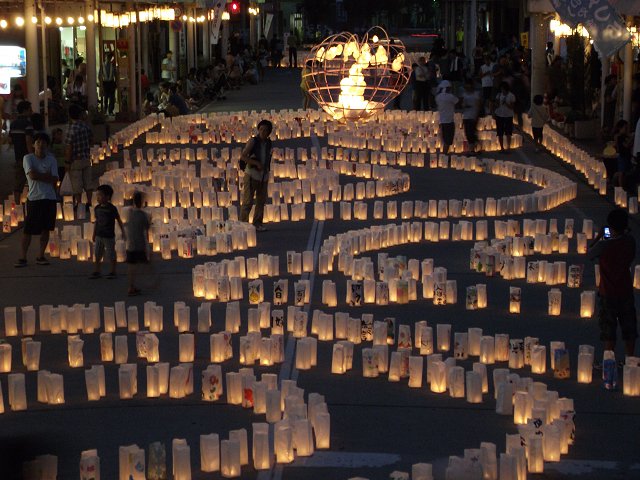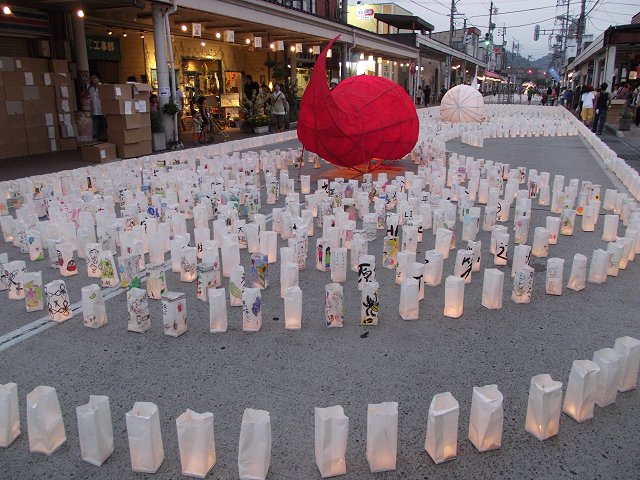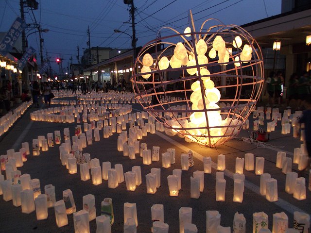 飯山市の中心商店街で10日、いいやま灯篭まつりが開催され、震災復興への祈り、新幹線開業に寄せる夢や期待を描いた灯篭が通りを彩りました。