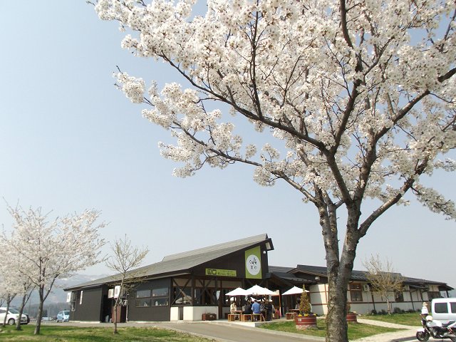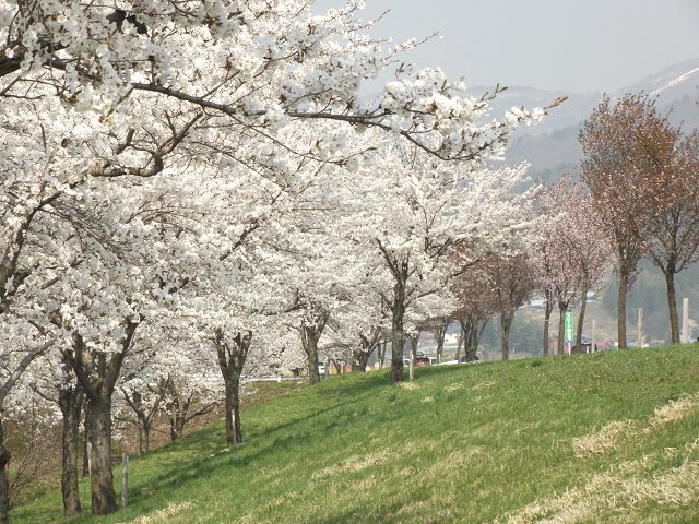 飯山市常盤の国道117号線沿いに続く満開のサクラ並木。